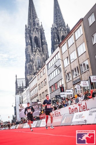 Am Renntag ging es dann früh mit der Bahn in die Stadt. Am Ziel angekommen habe ich mich für das Rennen fertig gemacht und wollte meinen After Race Beutel abgeben. Torsten, mein persönlicher Supporter für den Tag, brachte den dann zur Abgabestelle. Erstens war es ordentlich am Regnen, so dass ich mich für die Zeit trocken unterstellen konnte, zweitens konnte ich so ein paar Meter sparen. Als er wieder da war, machten wir uns auf zum Start. Es ging im Strom mit hunderten weiteren Athleten am Dom vorbei über die Hohenzollernbrücke zum Deutzer Bahnhof. Bisher lief alles nach Plan, wir hatten noch 15 Minuten bis zum Start. Ich stellte mich in den ersten Startblock und wartete darauf, dass es endlich losgeht. Monate, wenn nicht Jahre des Trainings galt es nun in diesem Moment auf die Straße zu bringen. Noch fünf Minuten, ich ziehe die Regenjacke aus und werfe sie Torsten an den Rand. Der Regen hat aufgehört und es kommt doch glatt die Sonne raus. Perfekt. In der Menge sind der Wind und die Temperatur nicht so schlimm. Noch eine Minute. Das Feld wird langsam nervös. Es schiebt sich alles noch ein paar Meter zur Startlinie. Aus den Boxen ertönt der Sprecher und beginnt den Countdown. 10....3-2-1 los. Nach ein paar Sekunden antraben geht es durch den Startbogen und ich starte meine Uhr.