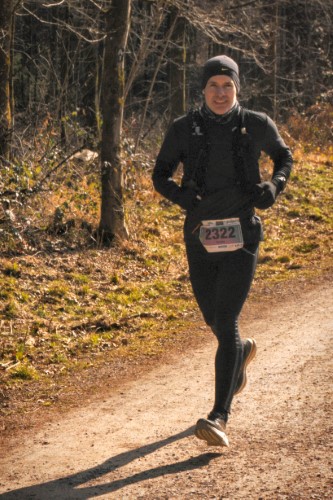 Kurz ein Gel und auf geht`s. Vor mir war allerdings niemand zu sehen, die TOP3 schienen weit weg. Nach ein paar Minuten kam Peter schon vorbei. Am Wendepunkt bekam ich ein "fünfter Platz" zugerufen. Vor mir schien nix machbar, hinter mir war auch keiner mehr. So hatte ich nicht die große Motivation all-out zu laufen. Hinzu kam der unebene Waldboden mit Schotterpassage auf dem Campingplatz. Ich hatte immer Angst um meine Sprunggelenke. Auf der zweiten Runde mischten sich die Überrundeten Teilnehmer auf die Strecke. Man wusste also nicht mehr, wer in welcher Runde ist und mit wem man noch kämpfen muss. Einer hinter mir sah schnell aus, und so habe ich die letzten 1 1/2 Kilometer nochmal etwas Gas gegeben. Kurz bevor ich in den Zielkanal einbog hörte ich den Sprecher den Viertplatzierten ankündigen. War ich doch noch so nah gekommen? Nach 1:05h war ich im Ziel. Fünfter Platz, was voll in Ordnung ist. Der vierte Platz (und der Altersklassesieg) war nur 15 Sekunden vor mir. Da wäre mehr drin gewesen. Peter hatte sich bis auf Platz drei vorgekämpft.